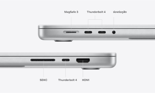 อีกหนึ่งไฮไลท์บน MacBook Pro คือการกลับมาของพอร์ตการเชื่อมต่อหลังจากห่างหายไปนาน มีทั้งพอร์ต HDMI, พอร์ตสำหรับหูฟัง, พอร์ตสำหรับ MagSafe, พอร์ตสำหรับ SD Card และ พอร์ต Thuderbolt 4 จำนวน 3 พอร์ต ช่วยถ่ายโอนข้อมูลได้รวดเร็วยิ่งขึ้น