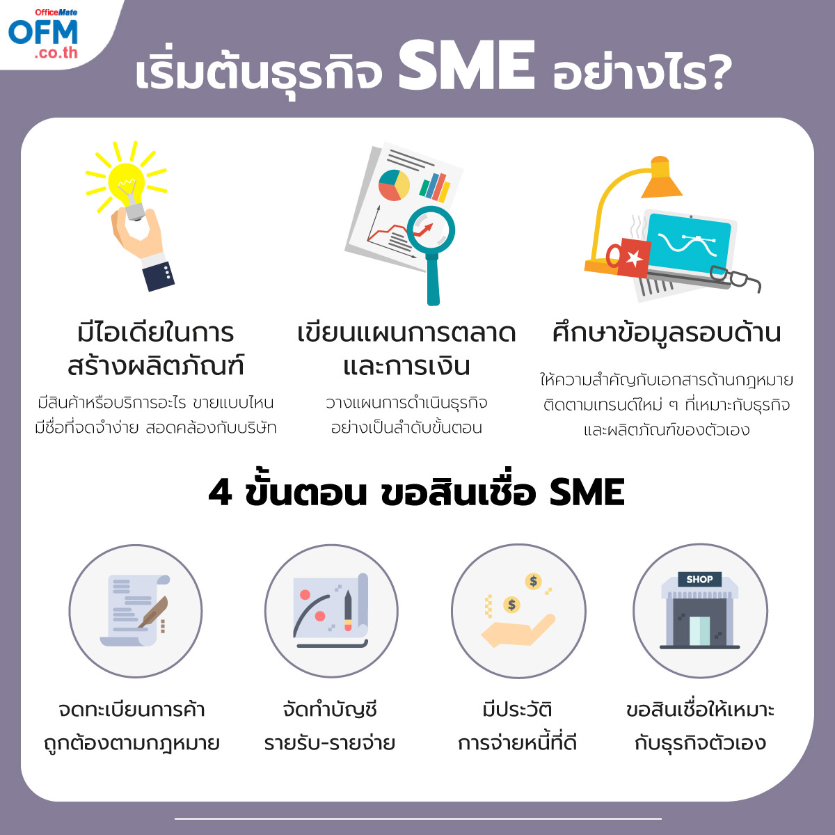 การเริ่มต้นธุรกิจ SME แค่เพียงไอเดียอาจจะไม่เพียงพอ เพราะต้องอาศัยศิลปะของการบริหาร ประกอบกับประสบการณ์ในการดำเนินธุรกิจเข้ามาช่วย สำหรับผู้เริ่มต้น อาจจะต้องทำความเข้าใจถึงปัจจัยต่าง ๆ ไม่ว่าจะเป็นเรื่องของความแตกต่างระหว่าง SME กับ Startup แนวทางในการเริ่มต้นธุรกิจขนาดย่อม หรือการขอสินเชื่อ SME เพื่อนำมาใช้ในการดำเนินธุรกิจ ซึ่ง OfficeMate ได้รวมเอาแนวทางมาให้กับเหล่าผู้ประกอบการหน้าใหม่ในบทความนี้แล้ว มาดูกัน
