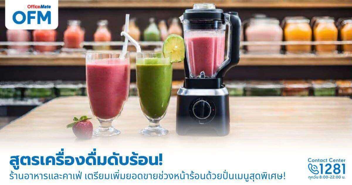 หน้าร้อนปีนี้ อุณหภูมิพุ่งสูงจนแทบจะทนไม่ไหว หลายคนคงกำลังมองหาเครื่องดื่มเย็น ๆ ดับกระหาย คลายร้อน ช่วยให้รู้สึกสดชื่นขึ้นมาบ้าง ในฐานะเจ้าของร้านอาหาร หรือคาเฟ่ การมีเมนูเครื่องดื่มที่ตอบโจทย์ความต้องการของลูกค้าในช่วงหน้าร้อน ย่อมส่งผลดีต่อยอดขายอย่างแน่นอน เพราะฉะนั้น อย่าพลาดโอกาสทองนี้ไป!OFM ขอเสนอสูตรเครื่องดื่มดับร้อน 5 สูตร 5 สไตล์ ที่ทั้งอร่อย สดชื่น และทำง่าย แค่มีวัตถุดิบ กับเครื่องปั่นน้ำผลไม้ ดี ๆ สักเครื่อง ก็ทำได้แล้ว แถมยังเป็นเมนูทานง่าย เหมาะกับการนำไปขายในร้านอาหาร หรือคาเฟ่อีกด้วย
