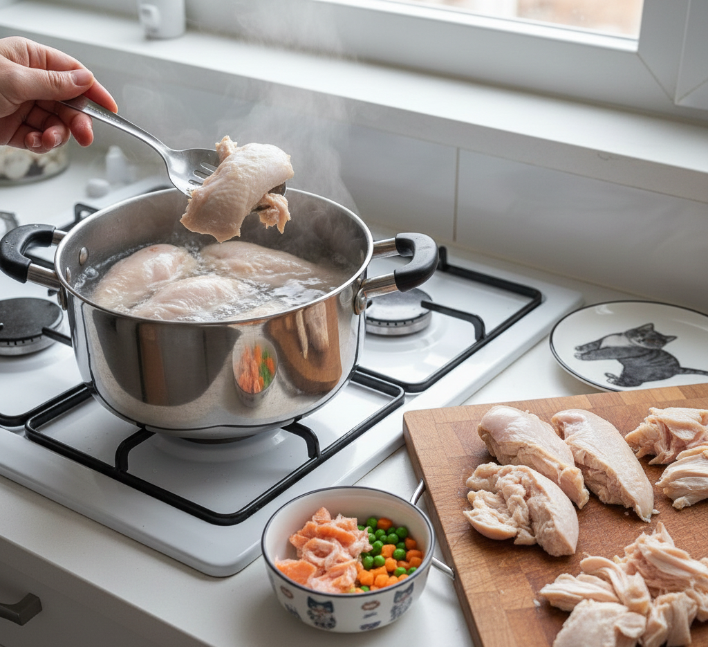 เมื่อถามว่า แมวกินเนื้ออะไรได้บ้าง ไก่ต้มคือคำตอบอันดับต้นๆ เพราะย่อยง่ายและให้โปรตีนสูง เหมาะเป็น อาหารบำรุงแม่แมว และแมวทุกวัยเพื่อเสริมสร้างกล้ามเนื้อ